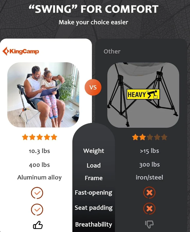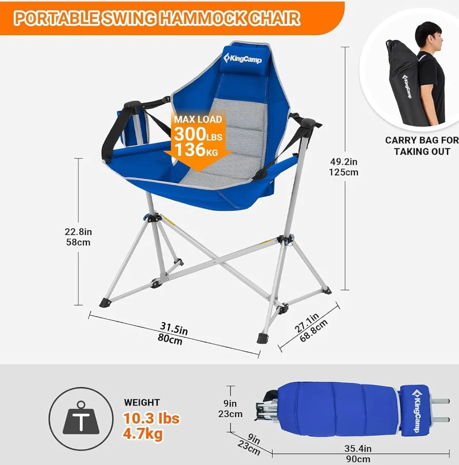 Subĉiela kampadejo estas 37.8 "x27.1" x49.2 ", vi havas ĉambran sidlokon por ĉirkaŭpreni senrestriktan, kaj alta apogilo povas plene subteni vian dorson. 22.8" ekster la tero, la balancanta tendaro estas perfekta por plenkreskuloj por streĉiĝi. kruroj libere.