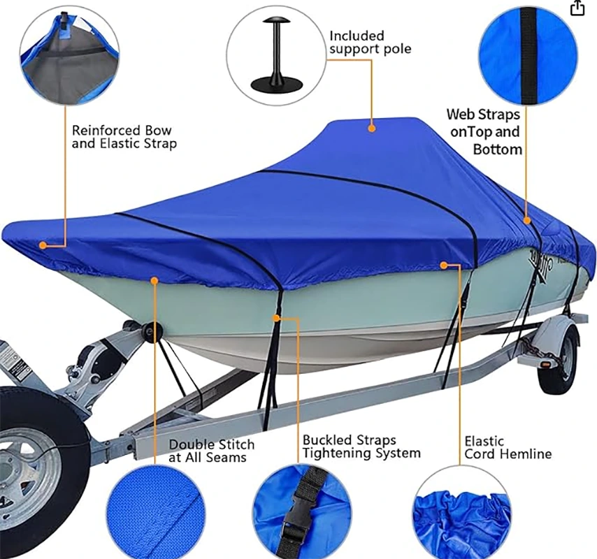 Trabo-Larĝo Akvorezista Boat Kovro Jaĥta Kovro konvenas al V-Hull centraj konzolboatoj ĝis 22-24 ft longaj, kun trabo-larĝo ĝis 116 coloj kaj antaŭa glaco alteco ĝis 30 coloj.