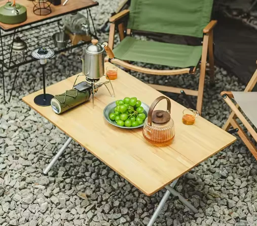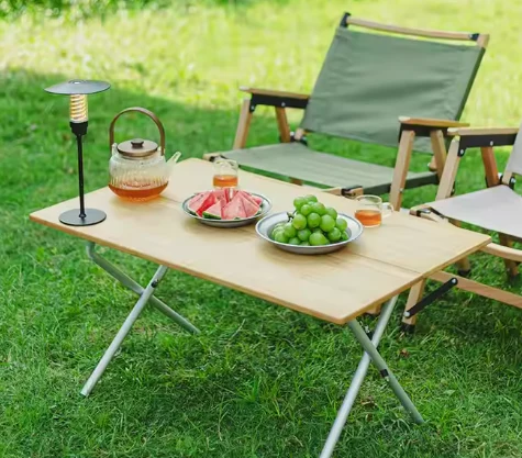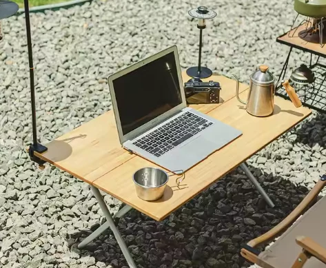 Faldebla portebla bambuo kaj aluminia tablo, kiu estas fortika, fortika kaj ekologia. Kaj efika akvorezista. La glata tablotuko estas perfekta por meti trinkaĵojn, manĝetojn aŭ kuiran ekipaĵon.