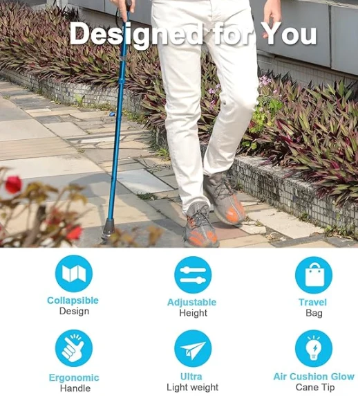 Faldebla teleskopa marŝanta kano, la beko lumas mem nokte, kio multe certigas la sekurecon de nokta marŝado. (Kun ekspozicio en lumo nur por certa tempo, la brila konuso venas al videbleco en mallumo.