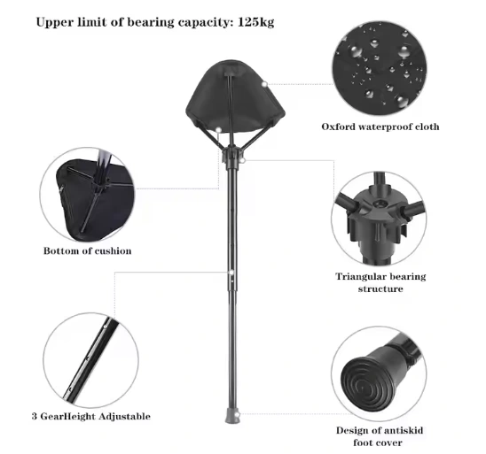 Faldebla vojaĝseĝo, finita kun duobla tavolo Oksfordo sur la tripieda sidloko, pli daŭra kaj stabila, ĉi tiuj tripiedaj tendaroj por plenkreskuloj 300 kg. Fiksas grandan kaj altan homon por ĝui komfortan sperton.