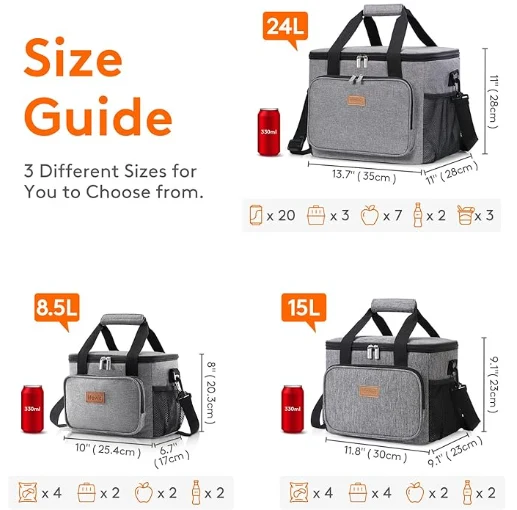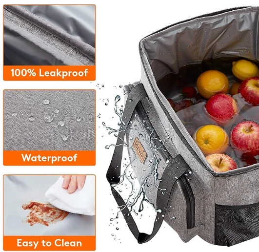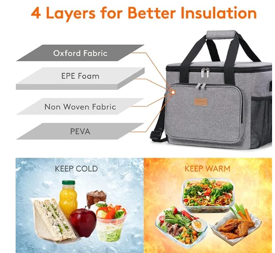 Granda Kapacito: Dimensioj - 13,8 "(35cm) × 11" (28cm) × 11 "(28cm). La maksimuma kapablo de tagmanĝujo por plenkreskuloj estas 24L, kaj estas sufiĉe vasta por stoki 40 kanojn da kokaĵo (330ml), aŭ via tagmanĝo kiel sandviĉoj, salato, serpentuloj, trinkaĵoj kaj fruktoj kaj tiel sur. Ĝi estas taŭga, salato, seruroj, trinkaĵoj kaj fruktoj.