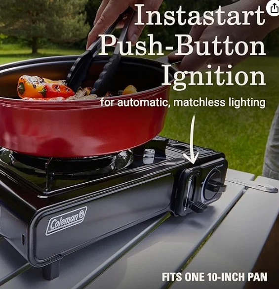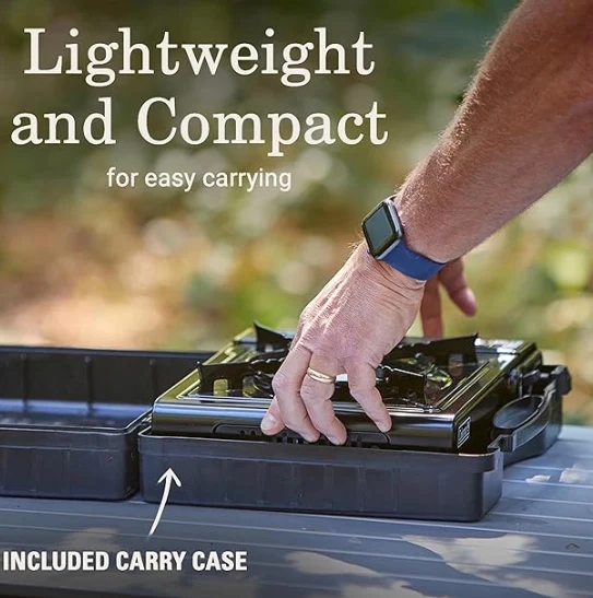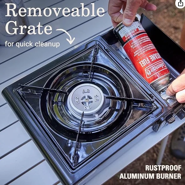Mini portebla subĉiela tendara forno.Porcelain-tegita krado estas forprenebla por rapida purigado; rust-pruva aluminia brulilo.zhejiang Jiayu Outdoor Products Co., Ltd. Instastart-ŝaltado por aŭtomata, senmova lumigado; 7.650 Tuta BTUS de Kuira Potenco