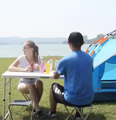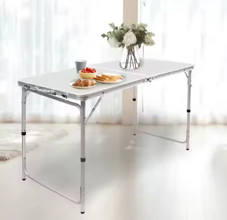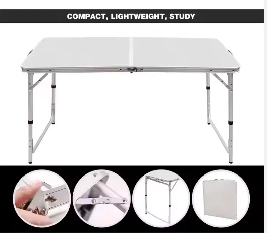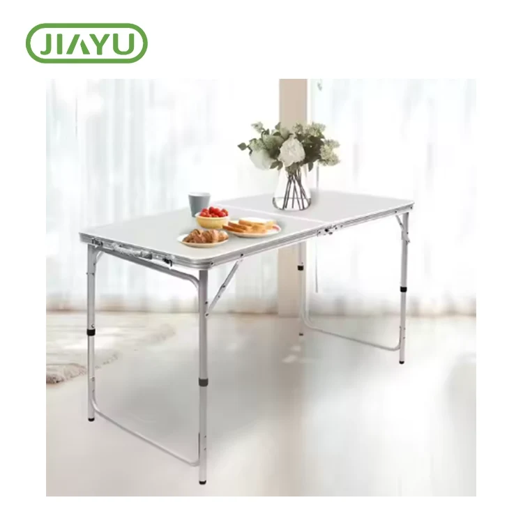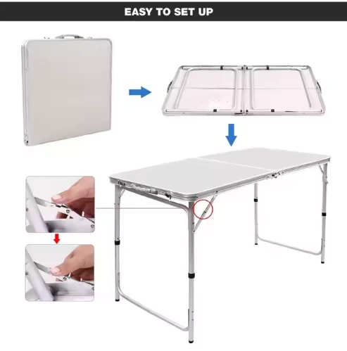 Portebla faldebla aluminia tablo, havas multfunkciajn uzojn, endomajn kaj subĉielajn, inkluzive de piknika tablo, plaĝa tablo kaj tendara kuireja tablo, kiuj estas uzataj por tendaro, strando, turismo, sportaj eventoj, RV ekstere kaj fiŝkaptado.