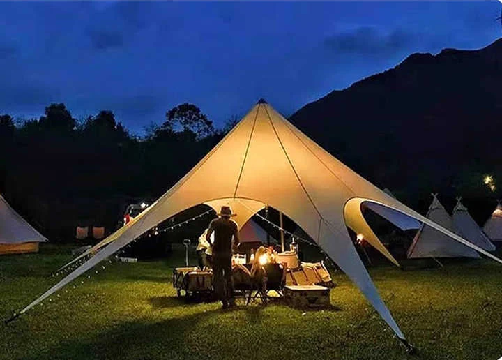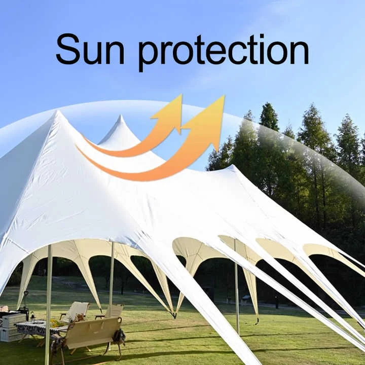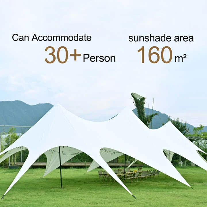 Sunshade Akvorezista Grandaj Subĉielaj Tendoj Ideala por pasigi tempon subĉiele en la pluvo komforte kaj daŭra dum longa tempo uzante, pli facile zorgema ol kanvasaj tendoj